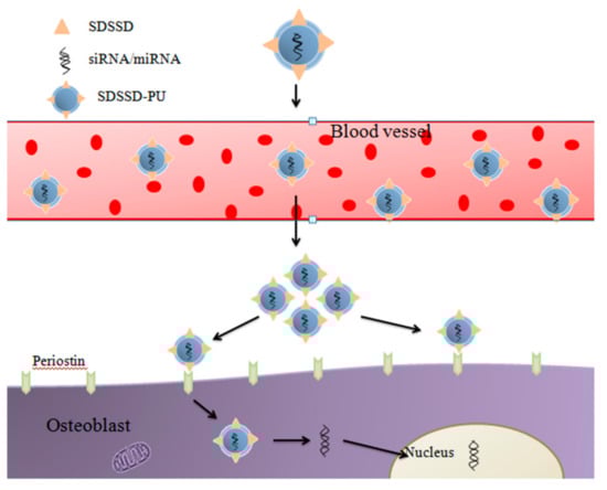 Recently, the research has oriented in the development of targeted systems to target either osteoblast [89] or bone formation surfaces [90] or bone resorption surfaces [91]. The system developed by Yao Sun et al. employs the osteoblasts targeting peptide-based Ser-Asp-Ser-Ser-Asp (SDSSD)-modified polyurethane (PU) nanomicelles (Figure 8). These nanomicelles encapsulating anti-miRNAs for delivery to osteoblasts had shown the selective targeting abilities of nanomicelles not only to osteoblasts but also to the bone formation surfaces without explicit toxicity or bringing out any immune response in vivo. Furthermore, results showed increased bone formation, bone micro-architecture, and bone mass in an ovariectomized osteoporosis mouse model [89].