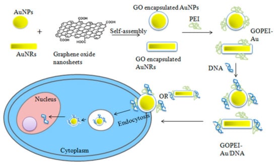 In various biomedical fields, graphene and its derivatives, as carbonic nanomaterials, are exploited because of their biocompatibility as nano-carriers. The surface modifications have allowed researchers to improve biostability, cellular uptake, and increase gene loading capacity by conjugating various polymers or ligands [119]. GO nanosheets can be used to encapsulate nanoparticles, such as gold and nanorods (Figure 9). When complexed and used for transfection to HeLa cells, they exhibited good DNA binding ability and condensed plasmid DNA into nanoscale particles (150 nm). In vitro gene transfection demonstrated much lower cytotoxicity and higher efficiency [58]. GO assembled nano-aggregates cross-linked by ATP-responsive DNA strands developed for ATP-mediated controlled drug release system with high drug loading capacity, and ability of site-specific drug release has made it a promising aid for enhanced therapeutic efficacy in cancer treatment [120]. Due to the low cytotoxicity of graphene, its surface modification has led to the construction of new gene delivery systems. Such modifications may include conjugation with alkylated derivatives of different cationic polymers, such as polyethylenimine (PEI), polypropylenimine (PPI), and polyamidoamine (PAMAM), by linkers, such as surface carboxyl group, glycine, and spermidine. The transfection efficiency of these vectors, when evaluated by using green fluorescent protein (GFP) plasmid, PEI–GO conjugate bearing glycine linker, was found to be the most efficient vector [121]. It has also been demonstrated by enhanced green fluorescent protein (EGFP) transfection in HeLa cells that GO with polyethylenimine (PEI) is able to deliver genes inside the cells with mitigated cytotoxicity and improved transfection efficiency [116].