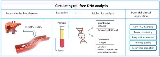 Schematic overview of circulating cell-free DNA analysis and its potential clinical application in hepatocellular carcinoma (HCC) setting. Circulating cell-free DNA (ccfDNA) can be released in the bloodstream from a variety of different cells under physiological and pathophysiological conditions. In cancer patients, a fraction of ccfDNA comprises circulating tumor DNA (ctDNA). ccfDNA can enter systemic circulation where can be isolated from serum or plasma. ccfDNA can undergo both quantitative (i.e., monitoring of changes in the ccfDNA concentration) and qualitative (somatic mutational profile, altered fragmentation and aberrant methylation pattern) analysis. The evaluation of the ccfDNA and its tumoral fraction, ctDNA, can improve the management of HCC patients permitting an early diagnosis, a better tumor monitoring (i.e., recurrence prediction, supervision of the dynamic tumor evolution) and an improved therapy outcome prediction that finally help clinicians in the treatment decision making.