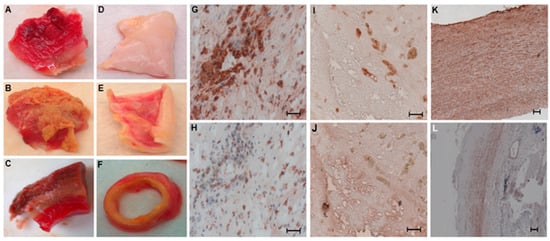 Macroscopic analysis of the human aneurysmal and control aorta samples (Figure 1) enabled us to position the luminal versus external side, respectively, for aneurysmal (Figure 1A,B) and control aortas (Figure 1D,E). Biopsy samples were then oriented before dissection into transversal sections (Figure 1C–F). The macrophage subtypes, M1 (CD68+MR−) (Figure 1G,H) and M2 (CD68+MR+) (Figure 1I,J), were identified by CD68 antigen staining (Figure 1G–I), which is a pan macrophage marker, and distinguished by the macrophage mannose receptor (Figure 1H–J), only present on the M2 macrophages []. As we previously showed, each subtype of macrophage was found in its own distinct area: anti-inflammatory macrophages (CD68+MR+) in the luminal side of the aneurysmal aortic wall and proinflammatory macrophages (CD68+MR−) in the more degraded adventitial layer as previously described []. No macrophages were detected in control aortas. We then performed α-SMA immunostaining for detecting SMCs: numerous SMCs were present, organized in multilayers in the control human aortic walls (Figure 1K). In contrast, in the aneurysmal aortas, SMCs were only observed in the media (Figure 1L).