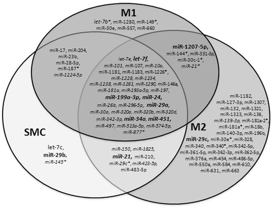 Among the 92 miRNAs detected, we set up a threshold for our subsequent selection based on the normalized value of miR-29b in order to ensure correct quantification by quantitative reverse transcription polymerase chain reaction (RT-qPCR). The miR-29b was previously reported to be downregulated in AAA murine models []. The following 10 miRNAs were selected for further analysis: let-7f, miR-199a-3p, miR-1207-5p, miR-21, miR-24, miR-29a, miR-29b, miR-29c, miR-34a, and miR-451. Six of them (let-7f, miR-199a-3p, miR-24, miR-29a, miR-34a, and miR-451) were common to both SMCs and macrophages. Both macrophage subtypes contained miR-1207-5p, and both SMCs and M2 macrophages, miR-21. Two miRNAs were specific to a single cell type: miR-29c was only detected in M2 macrophages and miR-29b in aneurysmal SMCs (Figure 2).