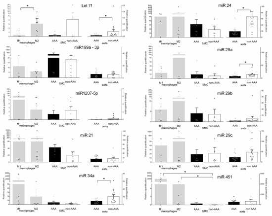 Quantification of the ten miRNAs selected in LCM-isolated cells and in the whole aortic biopsy samples by RT-qPCR with the ΔCt method. Differential expression in isolated aneurysmal SMCs (n = 6), M1 (n = 5), and M2 macrophages (n = 6) was quantified with isolated control SMCs as the reference and RNU6-2 for calibration. Differential expression in the whole aneurysmal aorta samples (n = 13) was quantified with the control aortas (n = 13) as the reference and RNU6-2 for calibration. Data were expressed as mean 2−ΔCt ± SEM with individual values indicated by open circles. * p < 0.05.