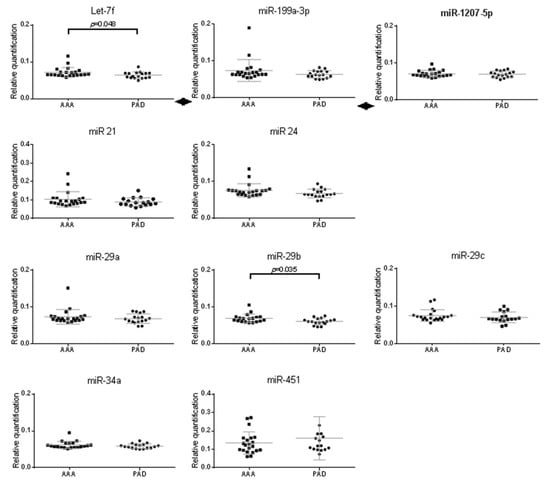Quantification of the ten miRNAs in plasma from patients with AAA (n = 22) and in patients with PAD without AAA (n = 17) by RT-qPCR with the ΔCt method with Syn-cel-miR-39 for calibration. Data are expressed as the mean ΔCt ± SEM and show the individual values obtained for each miRNA quantified. The exact p-value is indicated for the significant differential expression between PAD and AAA patients.