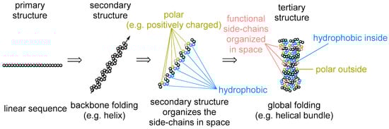 What are the constraints in the choice of basic building blocks (monomers) for these transient polymeric structures? In other words, to what extent was monomer appearance inevitable for life on Earth and how likely is it to expect this component to appear in a living organism elsewhere in the universe [1]? This question is especially frequently asked with regards to amino acid composition [2]. There are 20 + 3 amino acid residues that are templated in the ribosomal synthesis of proteins (coded into proteins). How did these amino acids end up in the protein code is a controversial matter that has been addressed via the analysis of the codon structures, RNAs, metabolic and prebiotic chemistries, physiochemical properties of amino acids, and other chemical and physical perspectives [3,4,5,6]. While questioning the amino acid repertoire, we tend to overlook that the amino acid identities represent only one aspect of the protein architecture: the primary sequence. There is however more to that: secondary structures (e.g., α-helix and β-sheet), motifs (hydrophobic, salt bridges, etc.), and tertiary folding (globular fold and membrane proteins) (Figure 1). Their appearance in protein architecture is rarely discussed or questioned. Meanwhile, this is exactly what the amino acid sequence is supposed to determine. Why do we not turn our perspective and ask ourselves: is it inevitable that proteins should span the membrane when making channels, pumps, or receptors? Or another question: does the α-helix/β-sheet pair have any alternatives in forming the main protein constituting element? Any kind of answer will provide an absolutely new and unique view on the set of the amino acids involved in protein biogenesis. In this article, we will use this perspective to propose a view on the amino acid repertoire establishment.