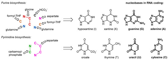 Our argument does not imply that the amino acids were not present in the RNA World and before, just the opposite. As a matter of fact, they were available for the outbreak of the protein biogenesis, and for that reason they should have been there in the RNA bound form. There is no way to avoid the use of such simple and abundant structures as amino acids, once biochemistry started. This is why we assume that the amino acids entered the biochemistry long before they started making proteins, and their initial use was different. The primary and essential role of the amino acids was involvement in metabolism. For example, in order to produce RNA molecules, there is a definitive need for some amino acid moieties. Nucleobases are inherently related to amino acids, as both are composed out of C/N/O/H atom combinations. In fact, all nucleobases are produced with the massive involvement of amino acids as the precursors (Figure 2). Some of those come to nucleobase heterocycles in complete pieces: glycine for purines and aspartate for pyrimidines. Thus, if we would consider that the RNA World existed for at least some time, we should expect the presence of amino acids involved in production of the RNA building blocks, nucleotides. While it has been suggested that the first synthesis of the nucleotides was performed on mineral surfaces [16], its potential transfer to the RNA bodies should require loading of the amino acid to the RNA bodies, which effectively lead to the aminoacyl-RNA esters.