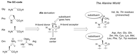 The appearance of the structure standard in the Alanine World has numerous consequences in modern biochemistry. Firstly, most of the amino acids can be interchanged by point mutations, while the secondary structure still remains intact. The fact that alanine mimics the secondary structure preferences of the majority of coded amino acids is exploited in Alanine-Scanning Mutagenesis, a laboratory method that helps to determine the ‘importance’ of a particular amino acid side-chain in the functions of a protein [41]. In this method, a residue is mutated to alanine (and not to proline or glycine!), thereby the side-chain functional group is removed while the backbone folding typically remains constant. The interchangeability of the alanine-derived genetic repertoire can also be seen in the fact that homologous proteins share only some part of the sequence identity (e.g., 90%, 80%, 70%, or even less), while still maintaining the same fold and functions [42]. This could not be possible without the common structure standard. Another consequence from the shared alanine architecture is the letter approximation. In the RNA and DNA sequences, we assume these to be composed out of ‘letters’ due to the fact that there is same backbone, and only the nucleobase identify differs between the individual nucleotides. The same approximation is transferred to protein sequences that are also considered to be composed out of 20 amino acid ‘letters’. This is due to the fact that the amino acids share the same common architecture, the alanine core, with only the side-chain substituents varying. In the case of a more diverse backbone, for example, involving secondary, β-, or d-amino acids, for each sequence combination there would be a complex pattern of the backbone structures and the side-chain placements in space. As the result, it would be very difficult to create the alphabetical abstraction, and one would have to consider the actual chemical constitution instead.