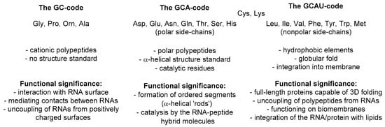 The history of the protein biogenesis is the history of coding. There are 20 amino acids that are universally coded to the proteins, each having a correspondence to an element in the coding RNA (DNA) sequence. The coding units are called codons, and the correspondence between them and the amino acids in the polypeptide sequence is called the genetic code. In biochemistry, the genetic code does not mean what is written, but how to interpret what is written—the rule of decoding. However, this rule is not simple, as it involves 20(+3) amino acids and 64 (61 + 2 coding) different codons, combinations thereof, and a complex way of decoding [20]. One of the common theories [21,22] suggested that the coding (i.e., association between codons and amino acids) was arbitrary once started, and then probably developed via an expansion. Then it reached a point, when no further expansion was possible, thus the code was settled or “frozen”, and this is the genetic code as it is now [23,24]. How did this development go?