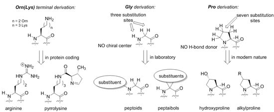 Similarly, if we envision formation of the proteome from the glycine structure directly, we could draw many possibilities (Figure 5). The glycine structure is so simple and generic that discussing different derivation options could severely exceed the length of one article. Here, we would like to mention peptoids, peptide structures, where the side-chain is placed at the nitrogen rather than carbon atom in the backbone [44]. Peptoids have been studied in applied chemical research, but in biochemical settings these structures could exhibit many interesting features. For example, they lack the H-bond donor site, and they do not necessarily have a chiral center in their structure, as such the chirality features of the backbone folding (e.g., helix handedness) can be a flexible element. Another notable class of peptides is peptaibols, the structures with two substitutions at the α-carbon. The simplest structure in this set 2-aminoisobutiric acid, which favors the α-helix, whereas larger substituents can help stabilize other backbone conformations such as 310-helix [45] or fully extended 2.05-helix, an unusual structure not present in natural proteomes [46].