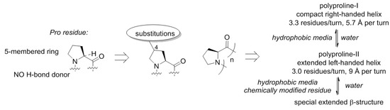Though, the name of the structure indicates relationship with proline due to the fact that it was discovered in polymeric proline [49,50], and this happened for a reason. The proline structure lacks a hydrogen bond donor site (N–H), which precludes formation of α-helical or β-strand structures. This is however, not unique, and also observed with other N-alkylated amino acids (e.g., sarcosine). A more special property of proline is that this residue is cyclic and forms a five-membered ring. The ring structure of proline has the consequence that the number of molecular arrangements in space, molecular conformations, becomes limited (Figure 6). As a result, polymeric proline can adopt only a few types of conformations [51]. Polyproline-II is one of the backbone conformations featured by proline, and this is the dominant structure for this scaffold in water. In nonpolar solvents, another helix becomes dominant, the polyproline-I helix. These helices have very distinct geometric properties, and the transition between them is mainly driven by the polarity of the medium and the temperature [52,53,54]. However, it can also be manipulated with the substitution pattern in proline [55,56]. Moreover, it was recently shown that the oligoproline scaffold can also adopt a special type of a β-structure in case of certain chemical analogues [57,58].