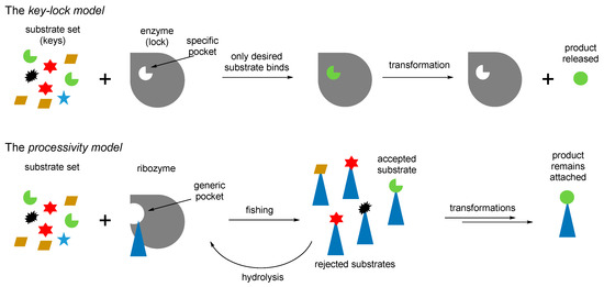 The key-lock model of enzyme chemistry versus the processivity model, which is likely to occur with the RNA mediated chemistry. The processivity model views the ribozyme as the Maxwell’s demon, a hypothetical creature that makes a system more complex through filtering. Many biological mechanisms operate this way [73].