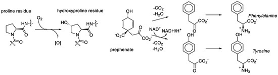 We consider it quite likely, though, that proline played a key role in bridging amino acid and sugar chemistries in the formation of the RNA World. That same amino acid was recruited among first in the transformation to the Protein World was nearly inevitable. However, the recruitment of the metabolic structures based on the generic alanine skeleton in the GCA-phase discarded the Proline World option. Why? Proline derivatives were simply not available. For example, what does it take to make hydroxyproline? Molecular oxygen, a component which was absent in the RNA World phase [78]. As noted above, the aliphatic ring or proline provides seven sites for substitutions, but they are relatively inert and require action of aggressive reactants such as molecular oxygen. In organic chemistry this is called the sp3-CH-activation problem. For comparison, the synthesis of tyrosine from prephenate involves the oxidative action of NAD, which is an anaerobic agent. Tyrosine (hydroxy-phenylalanine) is present in the genetic code and hydroxyproline is not (Figure 10).