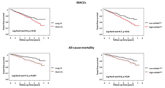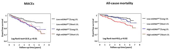 Kaplan–Maier plot of major adverse cardiovascular events (MACEs) and all-cause mortality for the leucocyte telomere length (LTL) and mtDNA4977 deletion. LTLs of <median value and ≥median value are stratified as short and long LTLs, respectively. mtDNA4977 deletion levels of >median value and ≤median value are classified as high and low mtDNA4977 deletion levels, respectively.