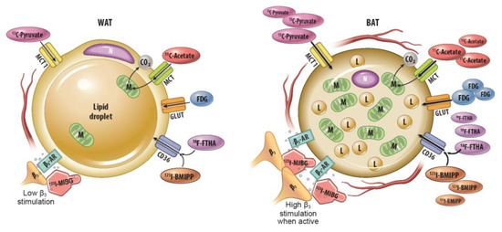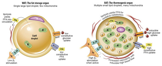 One potential target for medical therapies aimed at reducing obesity and preventing associated metabolic dysfunction is metabolically active fat tissue. Human infants have classical interscapular brown adipose tissue that is of myogenic origin and is analogous to the primary thermogenic fat depots in mice and other small mammals [7]. This tissue is thought to recede quickly with age [7,8]. However, a significant proportion of human adults have metabolically active fat tissue in the supraclavicular and cervical areas as detected by 18F-fluorodeoxyglucose (FDG) positron emission tomography (PET) following cold exposure [9,10,11]. Unlike classical brown adipose tissue (BAT) with its relatively homogenous collection of multilocular adipocytes, metabolically active fat tissue in adults has multilocular adipocytes of adipogenic precursor origin interspersed among typical, unilocular white adipocytes [12]. Like adipocytes in classical BAT, multilocular adipocytes in this adult tissue (which goes by multiple terms including “beige” and “brite” adipose tissue, but will be called inducible BAT [iBAT] in this review, consistent with a National Institutes of Health [NIH] convened expert panel’s preferred terminology) generate heat and consume energy stores through mitochondrial uncoupling via Ucp1 [12,13]. Its presence is thought to decrease with age, obesity, and has been shown to be usually lower in men than women in several studies [14,15,16], although in clinical practice there is wide variation. Figure 1 summarizes the physiological differences between thermogenic BAT and lipid-storing WAT.