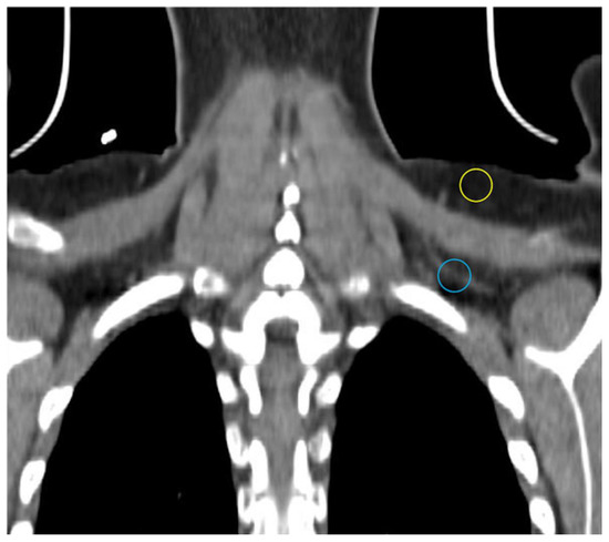CT showing different density and vascularity of BAT versus WAT. Subcutaneous WAT with a darker appearance on conventional display and fewer vessels (yellow circle) compared with BAT (blue circle).