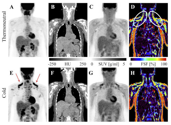 MRI vs. FDG-PET/CT in detection of BAT. FDG-PET/CT and MRI of a healthy BAT-positive research subject. FDG uptake is visible in supraclavicular BAT with cold exposure on the PET maximum intensity projection (MIP; E, red arrows) and absent from the thermoneutral PET MIP (A). CT shows adipose tissue in the same region (B,F) and PET shows increased standardized uptake value there after exposure to cold (C,G). MRI-derived fat signal fraction from the same subject shows adipose tissue with relatively low levels of fat (white ovals) in the same region at thermoneutral and cold conditions (D,H). Image reproduced with permission from reference 41.