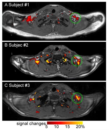 There are several emerging MR-based techniques. Functional MRI may be applied to detect changes in blood flow in activated iBAT in future research although few investigators have used it in BAT research thus far [46]. Blood oxygenation level dependent functional MRI signal increased in iBAT upon cold exposure in one small (n = 3) study with adult humans (Figure 4) [47]. MR thermometry is an emerging technique that measures tissue temperature and may provide an additional measure of iBAT activity [40].