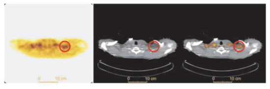 BAT is detected with other clinical and investigational radiotracers. 123I-metaiodobenzylguanidine (MIBG) SPECT/CT localizes sympathetic innervation by using a labeled norepinephrine analogue [75]. MIBG localizes BAT with similar sensitivity to FDG-PET/CT but is less temperature dependent [9,75,76]. The 11C PET tracer and norepinephrine analog 11C-meta-hydroxyephedrin has demonstrated sensitivity to BAT at thermoneutral conditions and its activity correlates with FDG uptake with acute cold in humans [77]. The commonly used SPECT/CT tracer 99mTc-methoxyisobutylisonitrile (MIBI), which localizes to tissues with high mitochondrial density, detects BAT in a non-temperature dependent manner as shown in an example from our clinical practice (Figure 9) [76,78]. 15O-labeled water PET/CT has been used in this setting to measure blood flow, which provides data to estimate tissue-specific metabolic rate using arterial oxygenation and known oxygen extraction fractions [77]. Din and colleagues combined 15O-labeled water PET/CT with inhaled 15O administration to directly measure tissue metabolic rate in humans [79]. The short (2 min) half-life of 15O allows for repeat PET scanning with another tracer on the same day [77,79]. Investigational radiotracer currently include the mitochondrial outer membrane translocator protein, visualized with 18F-FEPPA PET/CT and 11C-PBR28 PET/CT, the cannabinoid type 1 receptor, visualized with 18F-FMPEP-d2 PET/CT [80,81,82,83], and PD-L1, visualized with radiolabeled antibodies [84,85].