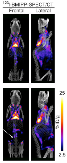 BMIPP is a fatty acid tracer routinely used for cardiac SPECT/CT in Japan [61]. It is transported into the cell by CD36 and trapped during incomplete β oxidation [62,63]. Although developed in the United States, it is not approved for clinical use by the Food and Drug Administration. Research with BMIPP likely requires on-site synthesis. However, synthesis does not require a cyclotron as the long (13 h) half-life of 123I makes it suitable for transport [64]. Additionally, 125I-labeled BMIPP produces high-resolution images on preclinical scanners and has a half-life of nearly 60 days [65]. In our hands, BMIPP identified BAT depots missed by FDG-PET/CT in mice (Figure 8) [30]. Additionally, BMIPP-SPECT/CT has a much more favorable signal-to-noise compared to FTHA-PET/CT [30]. We believe it is a measure of flux through the triglyceride pool.