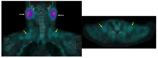 99mTc-MIBI uptake in iBAT on a clinical scan. Supraclavicular BAT uptake shown coronal and axial fused 99mTc-MIBI-SPECT/CT (yellow arrows). Salivary gland uptake (white arrows) is normal.