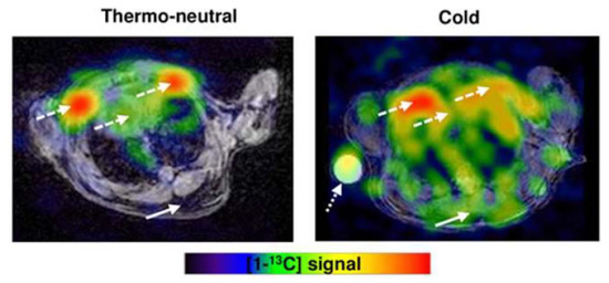 Carbon-13 produces a small magnetic field like hydrogen that can be utilized in MRI. However, its low isotopic abundance limits imaging without enrichment. Dissolution dynamic nuclear polarization (DNP) increases polarization of nuclear spins, greatly enhancing the generated magnetic field [89]. Commercial DNP systems now produce hyperpolarized 13C agents, most often pyruvate, for imaging studies. MRI obtained within about 1 min of hyperpolarized 13C-pyruvate injection show signal from downstream intermediates, notably lactate and bicarbonate, that indicate the rate of anaerobic (lactate) and aerobic (bicarbonate) metabolism in tissues [90]. The ratio of lactate/bicarbonate has been proposed as likely the most accurate metric generated in hyperpolarized 13C-pyruvate experiments as absolute values of 13C-lactate and 13C-bicarbonate are susceptible to effects of probe delivery and its membrane transport [90]. In a study by Lau and colleagues, hyperpolarized 13C-pyruvate MRI detected increased 13C-bicarbonate and 13C-lactate in BAT-associated interscapular regions of mice following norepinephrine stimulation [91]. Riis-Vestergaard then showed hyperpolarized 13C-pyruvate MRI of mice localizes BAT to the same regions as FDG-PET/MRI. The magnitude of increased metabolized pyruvate is similar to the magnitude of increased FDG uptake following cold stimulation, and there is increased anaerobic metabolism in BAT following cold stimulation (Figure 10) [92]. They also showed BAT increases metabolic activity independent of increased blood flow by adjusting for blood flow [92]. Advantages of this technique include lack of radiation and the ability to detect metabolic activity independent of blood flow. Disadvantages include limited availability, insensitivity to inactive BAT, and reliance on an upstream metabolic process.