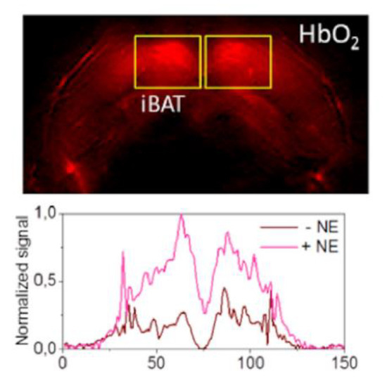 MSOT HbO2 map after norepinephrine treatment. MSOT image unmixed for HbO2 signal of murine interscapular BAT after treatment with norepinephrine (NE; top panel). BAT pads are shown in rectangles. The bottom panel shows the horizontal intensity profile with and without NE treatment. Image reproduced with permission from reference 95.