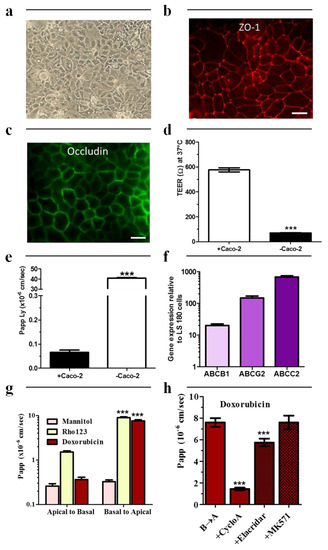 Efflux transport system was then evaluated in our culture conditions. Expression of P-gp, BCRP and MRP2 (gene names ABCB1, ABCG2 and ABCC2, respectively) were quantified by real-time quantitative PCR (Figure 1f). The relative concentration (mRNA target/β-ACTIN) was 4.35 ± 1.5 × 10−4 mRNA for ABCB1, 53.30 ± 9.13 × 10−4 mRNA for ABCG2 and 257.90 ± 21.10 × 10−4 mRNA for ABCC2, respectively. In addition, the relationships mRNA expression—transporter activity were determined by investigating the permeability of known efflux transporter substrates (Figure 1g). a→b (absorptive) and b→a (secretory) permeability of mannitol (negative control), rhodamine 123 (R123, P-gp, and BCRP substrate [17]) and doxorubicin (P-gp and MRPs substrate [18]) were determined. As expected, the apparent permeabilities in absorptive direction were low: 0.26 ± 0.03 × 10−6 cm/s, 1.51 ± 0.01 × 10−6 cm/s and 0.36 ± 0.03 × 10−6 cm/s for mannitol, R123 and doxorubicin, respectively. The apparent permeabilities in secretory direction were upper than in absorptive, 8.94 ± 0.40 × 10−6 cm/s and 7.60 ± 0.40 × 10−6 cm/s for R123 and doxorubicin but similar for mannitol (i.e., 0.32 ± 0.03 × 10−6 cm/s) suggesting a secretory active transport for R123 (efflux ratio (ER) = 5.96 ± 0.26) and doxorubicin (ER = 21.85 ± 1.11). In addition, in the presence of the multidrug resistance reversal agent cyclosporin A or elacridar (Figure 1h), the b→a permeability of doxorubicin was reduced by 80% and 25%, respectively, demonstrating an active efflux pump activity in these cells.