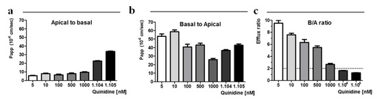At the lower concentration range (below 1 µM), a→b permeabilities of quinidine were low and constant, between 5.61 ± 0.76 × 10−6 cm/s and 7.87 ± 1.62 × 10−6 cm/s for 5 and 500 nM respectively. At the higher concentrations, (10 µM and 100 µM) the permeability values increased strongly to reach 33.76 ± 0.73 × 10−6 cm/s at 100 µM. The b→a apparent permeabilities of quinidine were highest at the lower concentrations and reached rapidly a value around 40 × 10−6 cm/s from 100 nM. As shown in Figure 2c, the calculated efflux ratio (B/A ratio) of quinidine decreased with increased donor concentration and became approximately a unit at 10 µM and more, suggesting saturation of P-gp-mediated efflux. Therefore, for quinidine concentration above 1 μM, the efflux ratio assay does not discriminate quinidine as a P-gp substrate clearly demonstrating the limitations of the ER calculation method in Caco-2 cells model.