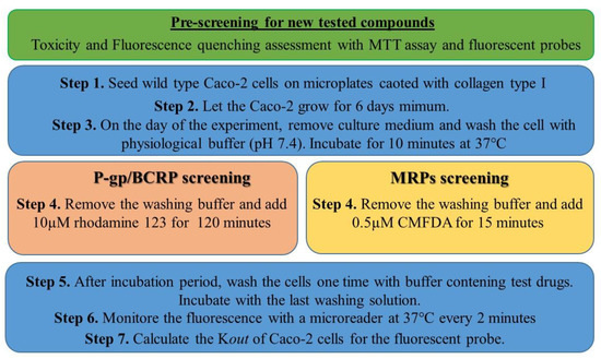Therefore, we developed a new method in order to counteract this limitation of the use of Caco-2 cells seeded on an insert. The newly proposed functional assay is based on the capacity of Caco-2 cells to pump out substrates of efflux pumps P-gp, BCRP and MRPs from intracellular cell compartment or cell membrane (summarized in Figure 3). In this assay, R123, is used as P-gp and BCRP substrate at a final concentration of 10 μM. 5-chloromethylfluorescein diacetate (CMFDA), final concentration 0.5 µM, is used as MRPs substrate [20].