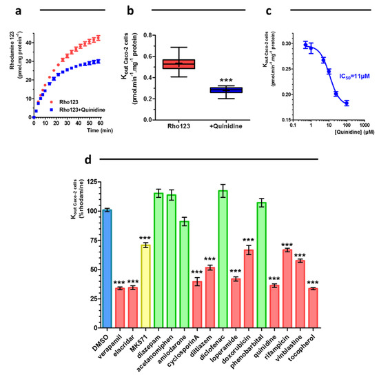 (a) Excretion of rhodamine 123 after incubation of cell Caco-2 monolayers in absence or in presence of 100 µM quinidine (mean ± s.e.m., n = 12). (b) Rate of excretion of rhodamine 123 after an incubation of cell Caco-2 monolayers in absence or in presence of 100 µM quinidine (box-and-whisker diagram, whiskers: min to max, mean: cross, n = 12, *** p < 0.001). (c) Concentration-dependent effects of quinidine on R123 excretion from Caco-2 cells (mean ± s.e.m., n = 12). (d) Effect of drugs on Rate of excretion of rhodamine 123 (mean ± s.e.m n = 12–66, *** p < 0.001).