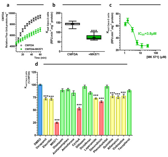 For MRPs-drug interaction assessment, MK571, cyclosporine A and doxorubicin decreased strongly the rate out of CMFDA (Figure 5d). Elacridar, loperamide, quinidine, rifampicin, verapamil and vinblastine reduced by more than 20% the kout of CMFDA (p < 0.001). No effect for other molecules were observed.