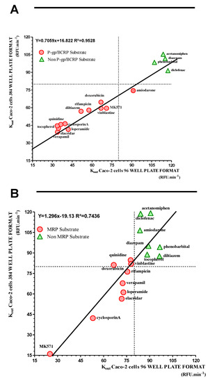 We then decided to miniaturize this system to rather use 384-well format instead of the 96-well format. All the data are summarized in Table 1. Figure 6a,b show that very good correlations are obtained when we compare the drug interaction with P-gp/BCRP (R² = 0.9528) and MRPs (R² = 0.7436) in the two formats. These correlations were confirmed by the value of the mean of ratio Kout obtained between the two tested culture formats. Indeed, these values are very close to the unit, i.e., ratio kout for P-gp/BCRP and MRPs are 1.009 ± 0.163 and 1.002 ± 0.230, respectively. Thus, decreasing the number of assays per plates will allow for sure to increase the speed of the screening and to decrease the cost of this kind of experiments.
