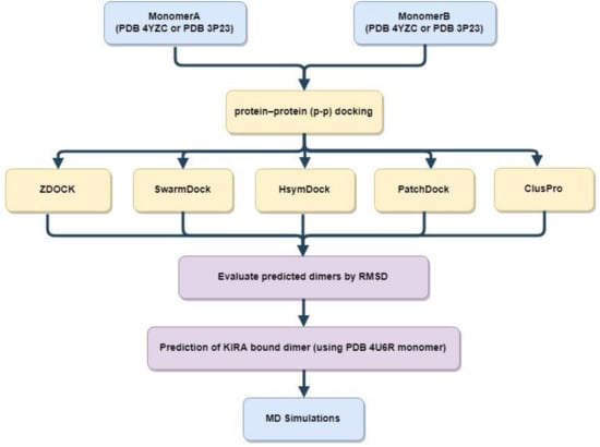 A protein–protein docking analysis was performed to understand the structural basis of IRE1 recognition and regulation mediated by KIRA. Initially, five different protein–protein docking programs were chosen: SwarmDock [], ZDOCK [], HsymDock [], PatchDock [], and ClusPro []. The ability of the programs to reproduce the native IRE1 dimers (PDB code 4YZC for back-to-back and 3P23 for face-to-face) was checked. Starting from the known crystallographic dimer structures of IRE1 in back-to-back (PDB code: 4YZC) and face-to-face (3P23) conformers, we split the crystal structure into monomers and explored the capabilities of the software to reproduce the two dimer complexes. The best performing program, SwarmDock [], was then used for predicting the structures of KIRA-bound dimers using the 4U6R PDB monomer structure. A schematic representation of the method used is shown in Figure 2.