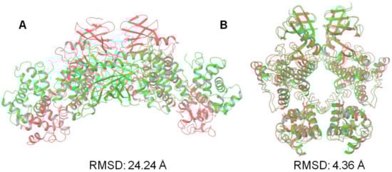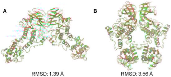 Superposition of the predicted best-scoring poses predicted by SwarmDock (green), onto the crystallographic dimer structures (red) of the IRE1 in (A) face-to-face (PDB code: 3P23) and (B) back-to-back (PDB code: 4YZC) conformations. The RMSD values based on the positions of the Cα atoms relative to the crystallographic structures are shown.