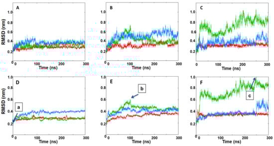The RMSDs of IRE1 face-to-face dimer Cα atoms during the three MD simulation replicas of (A) a native face-to-face crystal dimer structure (PDB code: 3P23), (B) KIRA docked in PDB 3P23 dimer, (C) protein–protein docked pose of PDB 4U6R in the face-to-face dimer form. Interface RMSDs of IRE1 face-to-face dimer Cα atoms during the three MD simulation replicas of (D) a native face-to-face crystal dimer structure (PDB code: 3P23), (E) KIRA docked in PDB 3P23 dimer, (F) protein–protein docked pose of PDB 4U6R in the face-to-face dimer form. Replicas 1, 2, and 3 are represented in red, green, and blue, respectively. Individual frames of the MD simulations labeled (a–c) are shown in Figure S4.
