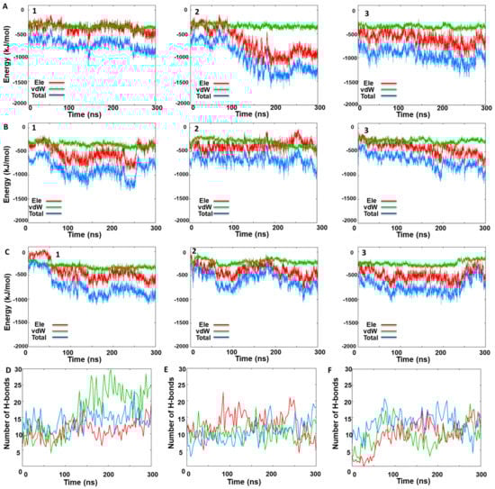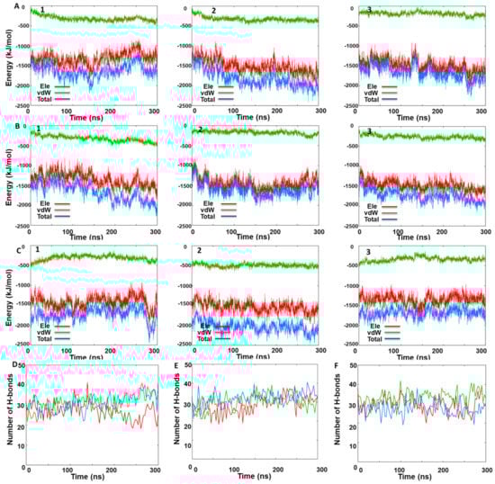 IRE1 face-to-face dimer MD simulations. Time-dependent interaction energy profiles for monomer A with monomer B during the three MD simulation replicas of (A) native face-to-face crystal dimer (PDB code: 3P23), (B) KIRA-docked face-to-face dimer (PDB code: 3P23), (C) protein–protein docked pose of PDB 4U6R in the face-to-face dimer form. Hydrogen bond analysis between monomers A and B during three MD replicas for (D) native face-to-face crystal dimer (PDB code: 3P23), (E) KIRA-docked face-to-face dimer (PDB code: 3P23), (F) protein–protein docked pose of PDB 4U6R in the face-to-face dimer form.