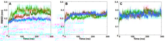 RMSDs of IRE1 back-to-back dimer Cα atoms during three MD replicas for (A) native back-to-back dimer from crystal structure (PDB code: 4YZC), (B) KIRA docked in PDB 4YZC structure, and (C) protein–protein docked pose of PDB 4U6R in the back-to-back dimer form. Red for Replica 1, green for Replica 2, and blue for Replica 3, respectively.