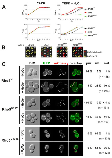 Growth and response to oxidative stress of Rho5G12V and Rho5C328L mutants. (A) Comparative growth behavior of strains with the indicated RHO5 alleles. Growth curves were recorded in rich medium in the absence or presence of hydrogen peroxide as indicated. (B) Tetrad analyses of crosses from strains carrying the indicated RHO5 allele to a sch9 deletion strain performed on rich medium (YEPD). Note that sch9 deletions grow more slowly and produce much smaller colonies than wild-type or rho5 deletions, and that rho5 sch9 double deletions are not viable. Yellow circles indicate tetrads carrying a wild-type RHO5 allele and a sch9 deletion, red circles mark the double mutants of sch9 with the RHO5 alleles indicated above each image. Parental strains crossed to HOD348-4D (sch9) from left to right were: HD56-RHwt (RHO5), HOD295-7D (rho5), HD56-R8 (RHO5G12V), and HD56-RHC328L (RHO5C328L). See Table 1 for genotypes. (C) Life-cell fluorescence microscopy of a rho5 deletion strain with a genomic IDP1-mCherry fusion as a mitochondrial marker (HCSO76-1A) expressing N-terminal GFP fusions of the Rho5 variants as indicated, each from a CEN/ARS vector. Cells were grown on synthetic media selecting for maintenance of the plasmid and either examined without further treatment (upper panels), or after addition of 4.4 mM hydrogen peroxide for less than 15 min (lower panels). The percentage of cells displaying association of the GFP signal with the plasma membrane (pm), being cytosolic or associated with internal structures (int), and those showing colocalization with the mitochondrial marker (mit) were determined for the total number of cells counted in each sample (n). Plasmids employed were pJJH1639 = GFP-Rho5; pLAO2 = GFP-Rho5G12V, and pCSO18 = Rho5C328L (Table 2). Images in the mCherry channel were obtained by 0.5 s exposures, those in the GFP channel by 2 s exposures. The size bar in the upper left differential interference contrast (DIC) image represents 5 µm, applicable to all images in the panels of the same strain.