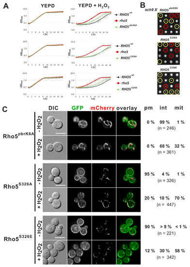 Growth and response to oxidative stress of mutants in the polybasic region of Rho5. (A) Growth curves were obtained in rich medium as described in materials and methods and the legend of Figure 2. (B) Tetrad analyses of crosses from strains carrying the indicated RHO5 allele to a sch9 deletion strain performed on YEPD. Parental strains employed in crosses to HOD348-4D (sch9) were HOD337-7D (RHO5pbrK6A), HD56-RHS326A (RHO5S326A), and HD56-R7 (RHO5S326E). Yellow and red circles indicate segregants with a RHO5 sch9 and a mutant RHO5 sch9 constitution, respectively. (C) Life-cell fluorescence microscopy of a rho5 deletion strain carrying IDP1-mCherry as a mitochondrial marker (HCSO76-1A) and the RHO5 alleles indicated as N-terminal GFP fusions introduced on a CEN/ARS vector. Plasmids employed were pCSO35 = GFP-Rho5pbrK6A, pCSO19 = GFP-Rho5S326A, pCSO31 = GFP-Rho5S326E (Table 2). Growth conditions, scales, and determination of distribution numbers were as described in the legend of Figure 2.