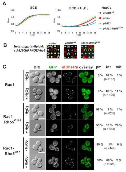 Based on the functional significance of the C-terminal insertion of 98 amino acids for the yeast GTPase described above, we created a chimeric construct, in which coding regions for the PBR and CAAX motifs of RAC1 were replaced by the C-terminal sequences of RHO5 (encoding Rac1-Rho5C110). Upon overexpression in a rho5 deletion, this construct restored the sensitivity toward hydrogen peroxide even more than that of the wild type, demonstrating its functionality in yeast (Figure 6A). Complementation capacity was also confirmed by viability of strains carrying this plasmid in a rho5 sch9 double deletion background (Figure 6B). It should be noted that, although growth could be restored in these transformants, colonies of the viable segregants were smaller than those carrying only the sch9 deletion with a RHO5 wild-type allele.