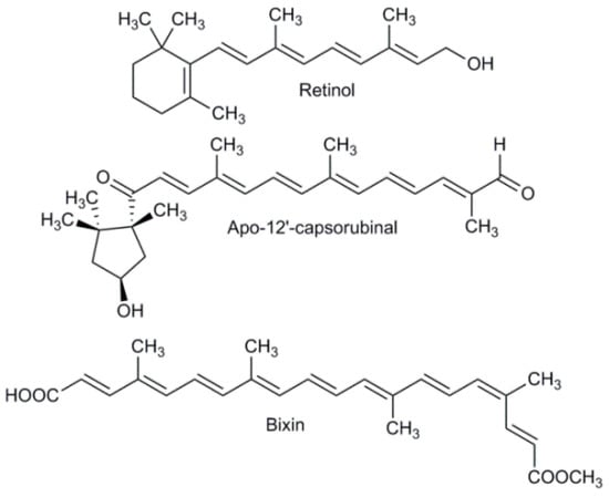Apocarotenoids have a structure similar to carotenoids but without C40 atoms (Figure 3). An apocarotenoid is considered a product of oxidative cleavage of carotenoids, and the most well-known apocarotenoids are Apo-12’-capsorubinal and bixin [,].