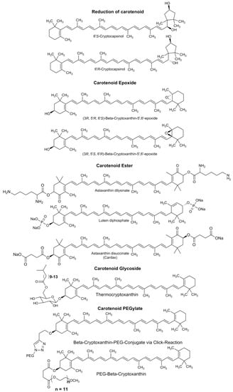 The synthesis of carotenoid derivatives with hydrophilic properties are a good alternative for incorporating this type of molecule with multiple therapeutic properties in aqueous medium [,]. Carotenoids have an important nutritional value since most of them are a source of vitamin A, antioxidant molecules with anti-carcinogenic properties, and the ability to prevent cardiovascular disease [,]. Synthesizing hydrophilic carotenoid derivatives is important due to their use as therapeutic molecules that improve the biological activity of carotenoids. Another reason to produce synthetic carotenoid derivatives is their increased water solubility. This property allows carotenoids to be widely used in the food industry as natural dyes. Several types of carotenoid derivatives have been synthetized, including reduced carotenoids, carotenoid epoxides, carotenoid esters, carotenoid glycosides, and PEGylated carotenoids (Figure 6) []. Below, we briefly describe the types of carotenoid derivatives synthesized with hydrophilic properties.