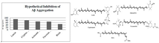 Hypothetical model of inhibition of Aβ aggregation by carotenoids and apocarotenoids. In this hypothetical inhibition of Aβ aggregation, lutein, a carotenoid with non-pro-vitamin A, showed the higher inhibition follow by cryptocapsin, a carotenoid with pro-vitamin A. After, astaxanthin and fucoxanthin, both of them are carotenoids with non-pro-vitamin A, and finally, Bixin, apocatenoid without pro-vitamin A.