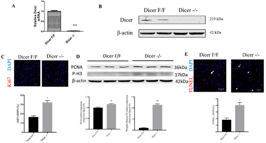 - Da Costa Martins, P.A.; Bourajjaj, M.; Gladka, M.; Kortland, M.; van Oort, R.J.; Pinto, Y.M.; Molkentin, J.D.; De Windt, L.J. Conditional dicer gene deletion in the postnatal myocardium provokes spontaneous cardiac remodeling. Circulation 2008, 118, 1567–1576. [Google Scholar] [CrossRef] [PubMed]