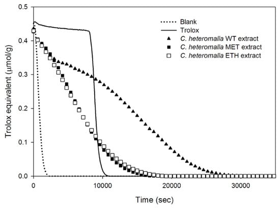 The method reported by Cao and Prior [] and Ninfali et al. [], slightly modified, was applied. The reaction mixture was prepared in the microplate as follows: 160 μL of Fluorescein 0.04 μM in Na–K phosphate buffer 0.075 M (pH 7.0); 20 μL of appropriately diluted extract in WT, MET, or ETH, obtained after 1, 2, and 3 days, or 20 μL of 100 μM Trolox, used as a standard reference. Each mixture was kept for 10 min at 37 °C in the dark, and the reaction was started with the addition of 20 μL of AAPH 40 mM. The fluorescence decay was measured at 37 °C every 5 min at λ = 485 nm excitation and λ = 538 nm emission, using a Thermo Scientific Fluoroskan Ascent F2 Microplate. The ORAC value refers to the net area under the curve of Fluorescein decay in the presence of sample extracts or Trolox, subtracted from the blank area. The activity of the sample was expressed as μmol of Trolox Equivalents (TE)/g of C. heteromalla powder, with the following equation: