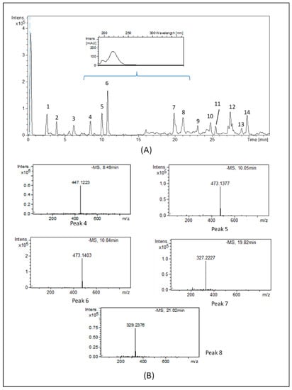 The HPLC-ESI-TOF-MS technique allowed for the detection of 14 compounds. The ions detected were tentatively identified according to their generated molecular formula after a thorough survey of the literature. A total of five phenolic compounds were tentatively identified in the C. heteromalla bryophyte extract. Indeed, benzoic, caffeic, and p-coumaric acid derivatives were detected in the samples. Concerning the benzoic acid derivatives, compound no. 4 was tentatively assigned as di-hydroxybenzoic acid hexoside-pentoside. This compound has previously been described in plants []. With regard to caffeic acid derivatives, two isomers were proposed. The first isomer (compound no. 5, eluting at 10.03 min) produced the base MS peak at m/z 473, characteristic of caffeic acid hexoside-pentoside or isomer. Molecular ion [M–H]- at m/z 473 and the same molecular formula (C20H25O13) was found for peak 6, eluting at 10.8 min and corresponding to the second caffeic acid derivative isomer. Several authors have characterized these compounds in plants [,,,]. Concerning p-coumaric acid derivatives, two chromatographic peaks corresponded to molecules of p-coumaric acid linked to hesoxide. Peaks no. 7 and no. 8, with m/z 327 and 329, and molecular formula C18H31O5 and C18H33O5, were tentatively characterized as dihydro-p-coumaric acid hexoside and its hydrated derivative, respectively [,,]. In the inset of Figure 3A, the UV spectra of the compounds described above are reported. Molecules showed the absorbance maxima at 230 nm, which is the typical wavelength of phenolic groups. The MS spectra of the main phenolic compounds identified in the sample are summarized in Figure 3B.