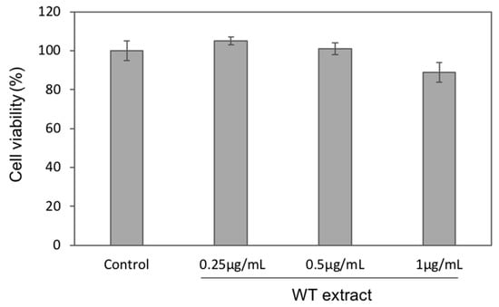 WT extract effects on NIH-3T3 cell viability. NIH-3T3 cells were treated with 0.25, 0.5, or 1.0 µg/mL of C. heteromalla WT extract for 24 h. Cell viability of each sample is expressed as the percentage between treated and untreated (Control) cells. The data are shown as the means SD of at least three separate experiments.