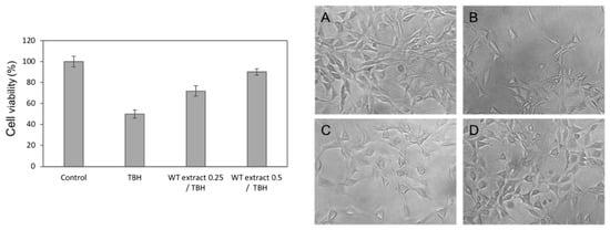 Therefore, the concentrations 0.25 and 0.5 µg/mL were used to investigate the ability of WT extract to counteract the oxidative stress induced in NIH-3T3 cells by tert-butyl hydroperoxide (TBH), a direct-acting oxidative stress-inducing agent. As shown by the histogram on the left of Figure 5, cell viability considerably decreased after overnight treatment of the NIH-3T3 cells with 250 µM TBH compared to untreated cells (Control). Conversely, when cells were treated with WT extract and TBH at the same time, an evident cytoprotection exerted by the extract was detected at both the tested concentrations. The cytoprotective effect was particularly pronounced in the case of the highest concentration (0.5 µg/mL) for which cell viability reached 90% (Figure 5, on the left). The WT extract protective effect was also confirmed by microscope observation (Figure 5C,D on the right).