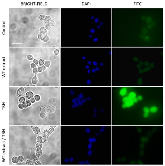 The intracellular ROS generated by the oxidative stress induced by TBH were also investigated by fluorescence microscopy using the DCFH-DA probe. Results confirmed the high protective effect of WT extract on oxidative stress at the concentration of 0.5 µg/mL. In fact, while cells treated with only TBH showed high green fluorescence, cells pretreated with WT extract before TBH addition presented a very weak fluorescence, comparable to the untreated cells (Control) and cells treated only with WT extract (Figure 7).