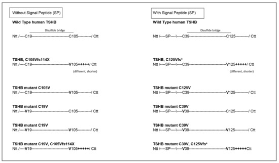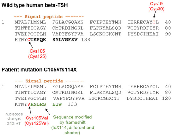 Central congenital hypothyroidism (CCH) is a rare but severe endocrine disorder with an incidence of about 1:50,000 [1]. One of the molecular causes for CCH are mutations in the TSHB-gene, which cause isolated TSH deficiency [2]. Of note, patients with the naturally occurring mutation c.313delT (C105Vfs114X) in the TSHB-gene show extraordinary early and severe signs of congenital hypothyroidism [3]. This is surprising, because it has previously been assumed that mutations in the TSHB-gene do not result in a severe phenotype, since the complete absence of TSH in patients with mutations in the PIT-1 gene or PROP-1 gene does not demonstrate a severe phenotype in most cases [4,5,6,7]. This has been attributed to the basal signaling activity (cAMP) of the TSHR, which may compensate for the absence of TSH induced signaling [8,9,10]. The mutation C105Vfs114X was first described in 1996, and so far 36 cases have been reported [11,12,13,14,15,16,17,18,19,20,21,22,23,24,25]. This mutation is caused by a T-deletion at nucleotide position 313 [11], resulting in a frameshift with a substitution of cysteine by valine at position 105 (amino acid sequence numbering without signal peptide) followed by eight non-homologous amino acids and a premature stop codon, thus lacking the five terminal WT amino acids (Figure 1) [26]. In other words, the 14 C-terminal (Ctt) amino acids in the WT are being exchanged by nine non-homologous amino acids (including the cysteine at position 105) in the C105Vfs114X mutation.