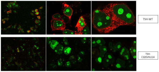 This system contains a vector, that encodes for two fluorescent proteins (AmCyan and mCherry). In addition, the plasmid contains a restriction site where a gene of interest (e.g., TSHB) can be inserted. AmCyan contains a nuclear localization signal (NLS) which moves into the nucleus (AmCyan) once the vector is expressed, while mCherry remains in the cytoplasm. In this way, AmCyan shows the levels of expression of the mRNA to protein, while mCherry monitors proper biosynthesis, transport and secretion [34]. For quantification, we used HEK293 cells, transfected with WT-TSH and mutants that were cloned into the vector nAmCyan-P2A-mCherry. The successful transfection and production of WT-TSH and the mutants were verified by visualization via a confocal microscope (Figure 2).